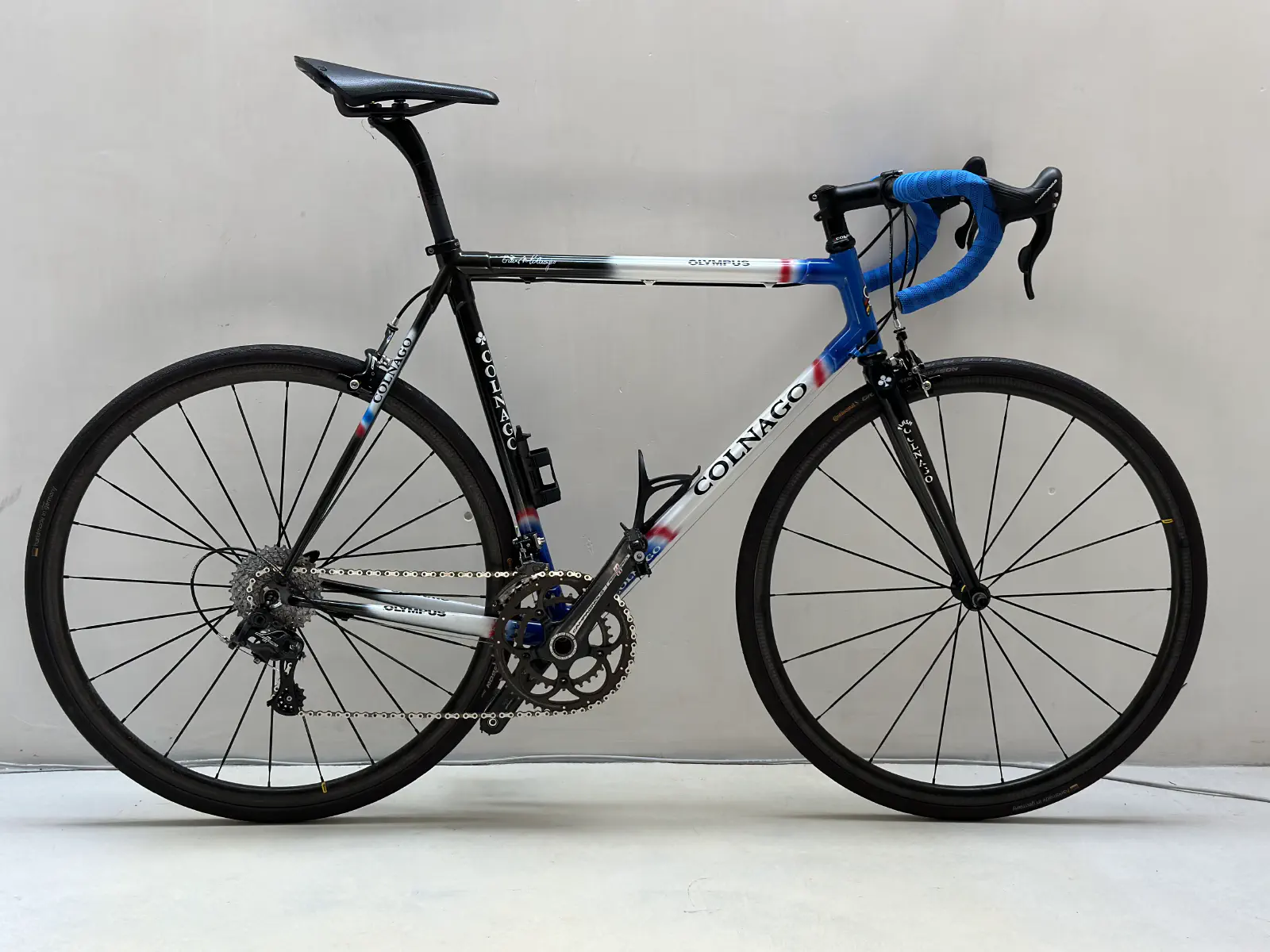 Colnago's legendary carbon race machine with original Team Olympus paint job. First generation C40 from 1996/1997 with glossy carbon resin finish and minimal wear. Threadless carbon fork. Exceptional rigidity and responsive handling characteristic of Colnago's racing heritage.